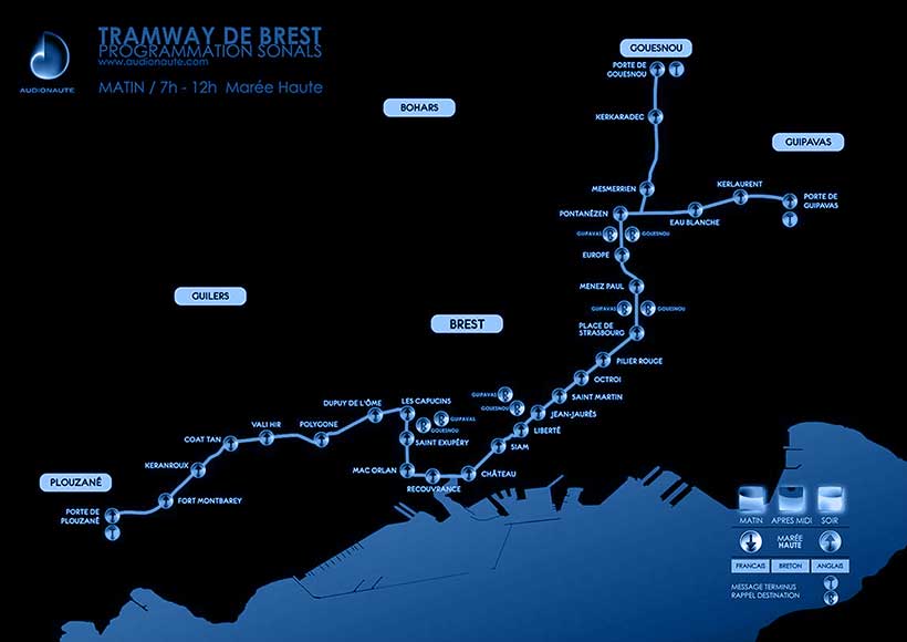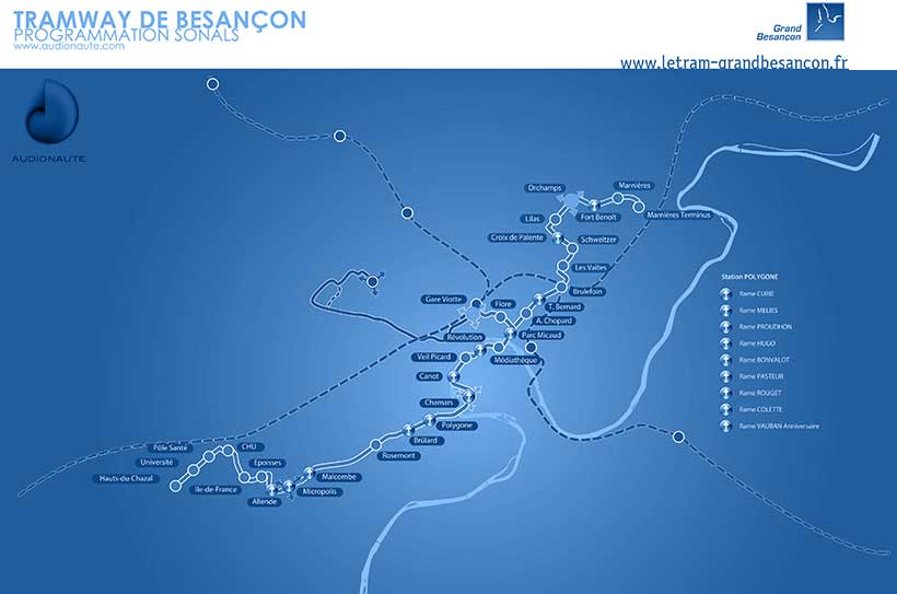 Le studio AUDIONAUTE innove pour les tramways de Nice, Brest et Besançon un programme d'annonces dites "sonals", voix et habillages sonores, permettant aux voyageurs d'identifier chaque station, chaque rame comme à Besançon.