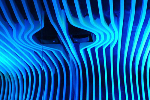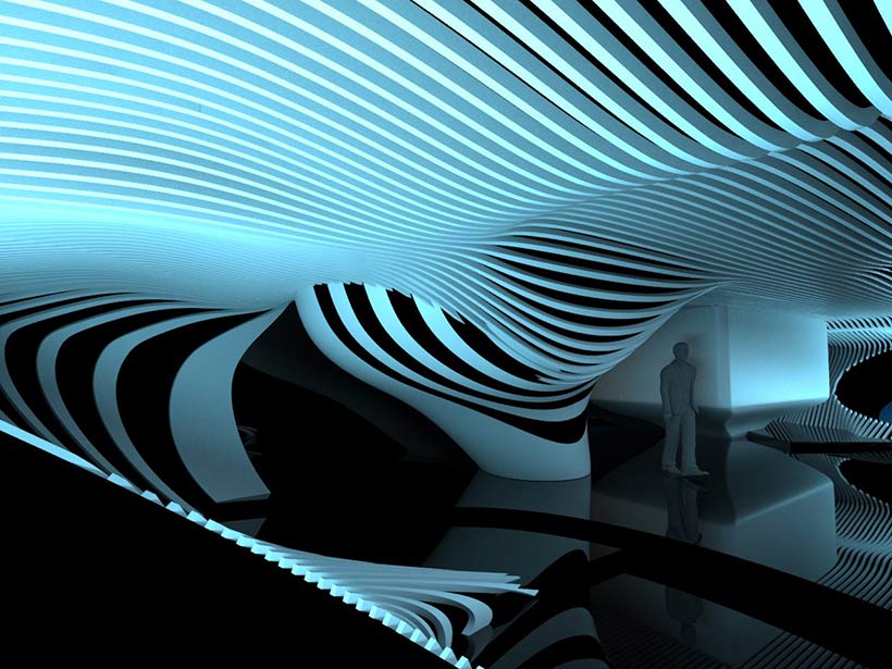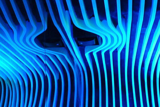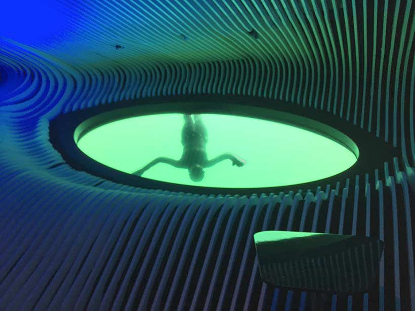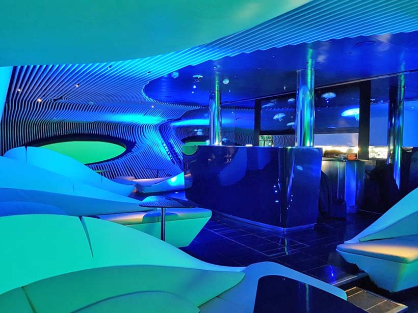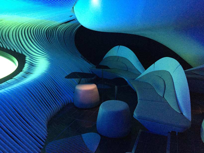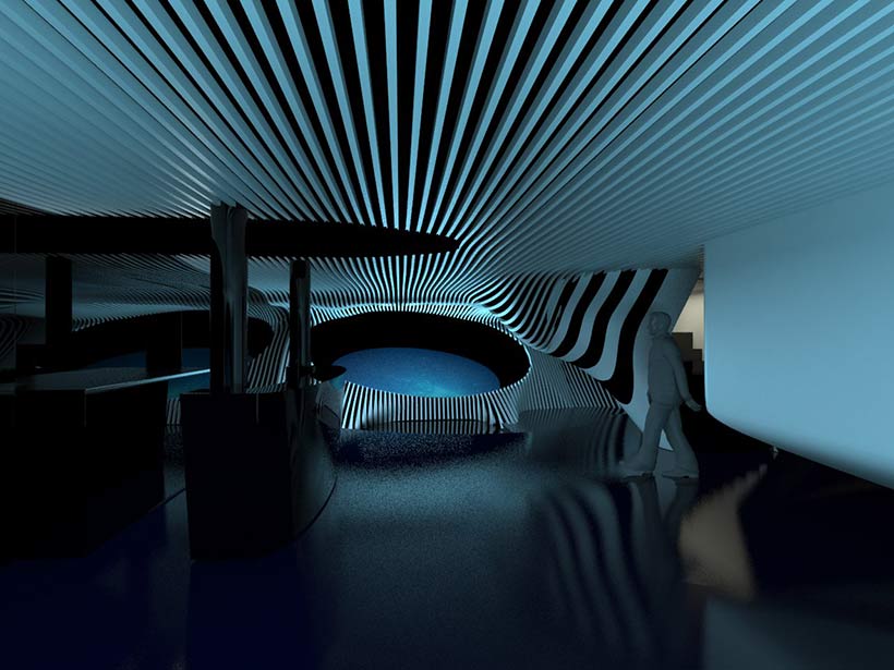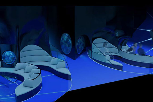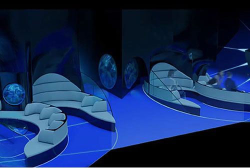 Le salon « Blue Eye » est équipé de grands sofas à conduction corporelle installant trente personnes pour un voyage sous les mers uniques : hublots géants, micros hydrophones captant le paysage sonore des profondeurs, spatialisation acoustique tridimensionnelle dans l’espace bionique dessiné par Jacques Rougerie. Une construction multimédia onirique oscillant entre l’imaginaire du Nautilus et des vaisseaux spatiaux de demain.