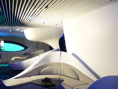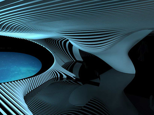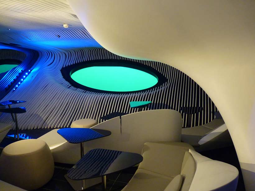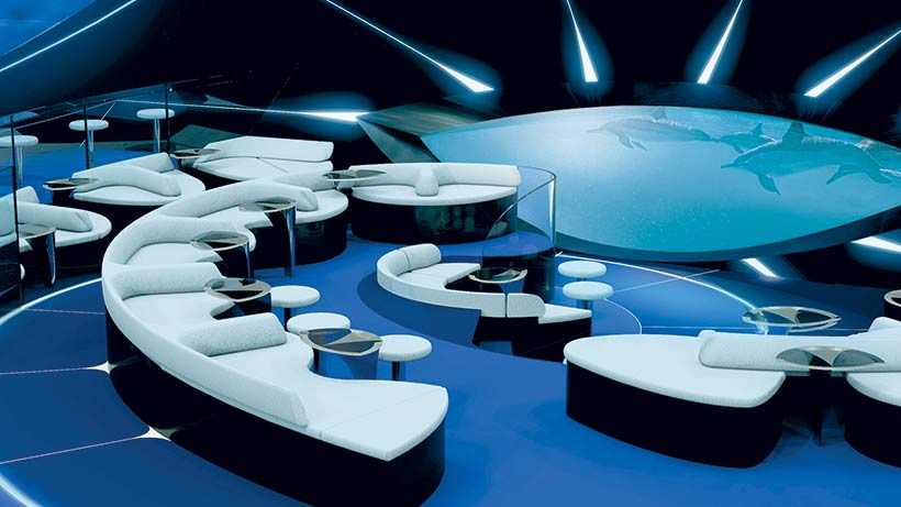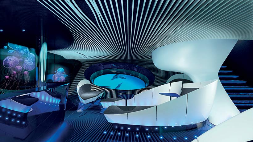 L’architecte Jacques ROUGERIE a conçu un salon sous-marin multimédia en puisant son inspiration dans l’observation de la nature. Les références graphiques de l’espace évoquent baleines, cétacés et méduses. Les lignes du salon, le positionnement du corps, le mobilier, toute l’attention se porte vers les deux hublots, en forme d’œil de cétacé, grands ouverts sur le monde subaquatique.