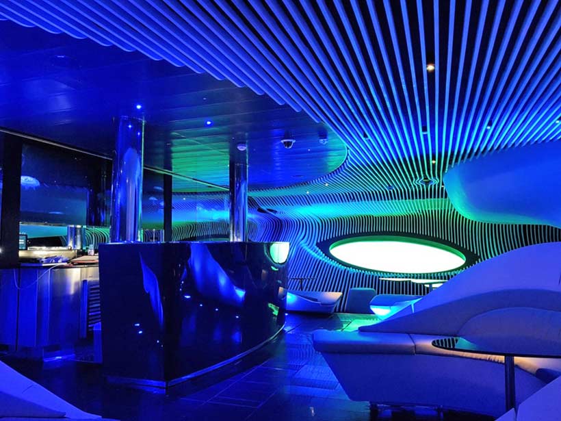 La mise en lumière du lieu est déclinée par touches, disséminées dans l’espace, laissent l’esprit et le regard se plonger dans le spectacle qui se déroule à l’extérieur. Le décor mural disparaît pour laisser la place aux écrans digitaux intégrés qui projettent les images des deux caméras placées à l’avant du navire