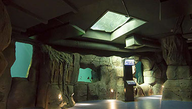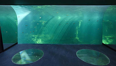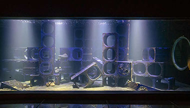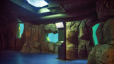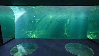Les systèmes sonores expérimentaux participent ainsi à la notion d’un son sensoriel, qui sollicite le visiteur pleinement : Projecteurs de son balayant tout l’espace du plancton pour essaimer des nuages de krill, banquette sensorielle pour flotter face aux mérous et surtout la salle de spectacle face au grand bassin immergeant les visiteurs dans une spatialisation sonore diffusée en 16 points puissants