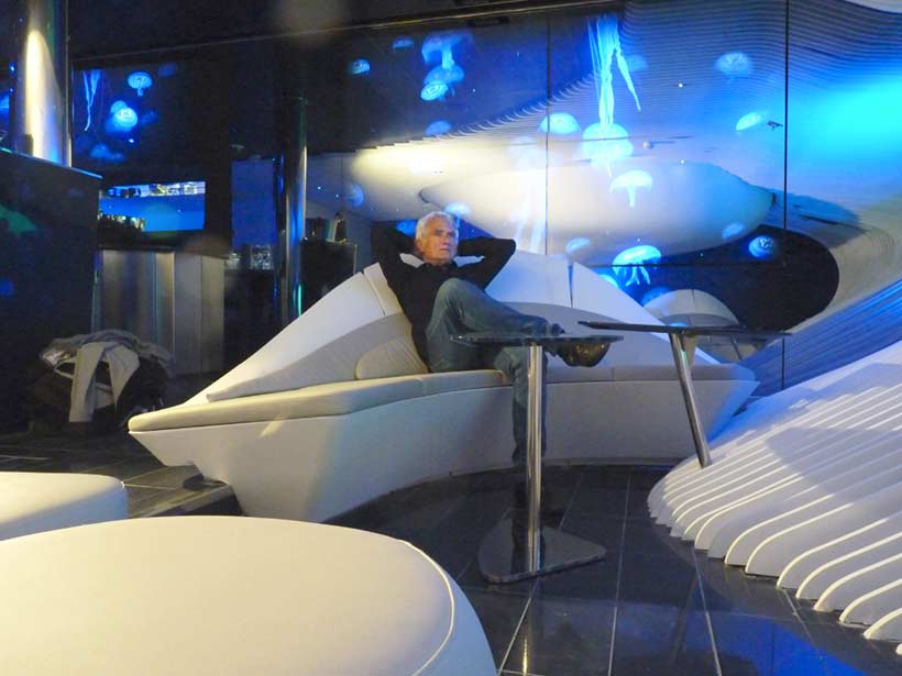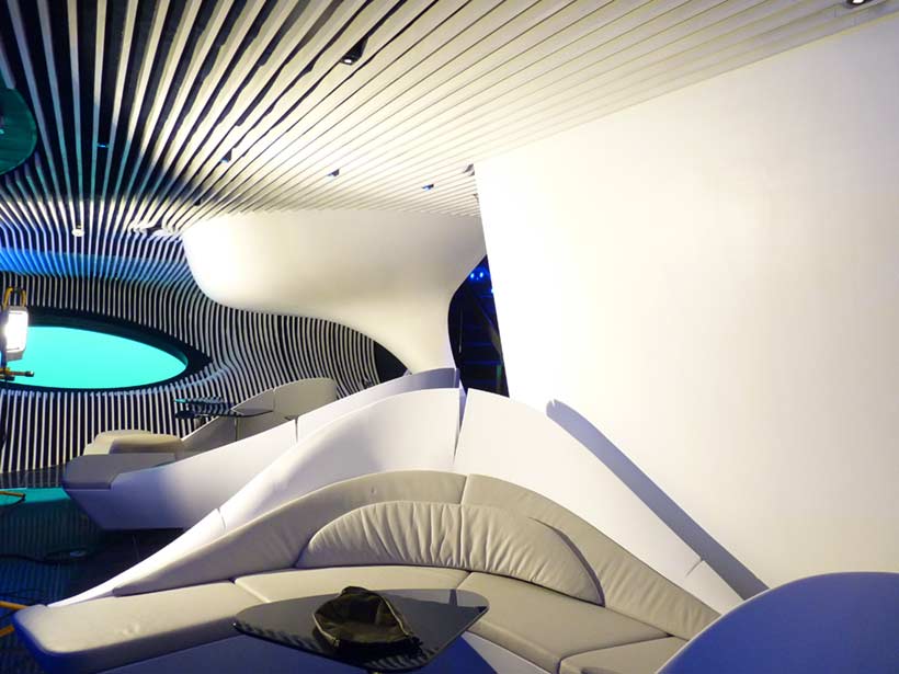 L’architecte Jacques ROUGERIE a conçu un salon sous-marin multimédia en puisant son inspiration dans l’observation de la nature. Les références graphiques de l’espace évoquent baleines, cétacés et méduses. Les lignes du salon, le positionnement du corps, le mobilier, toute l’attention se porte vers les deux hublots, en forme d’œil de cétacé, grands ouverts sur le monde subaquatique.