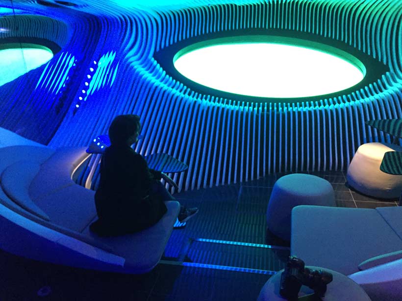 Le salon « Blue Eye » est équipé de grands sofas à conduction corporelle installant trente personnes pour un voyage sous les mers uniques : hublots géants, micros hydrophones captant le paysage sonore des profondeurs, spatialisation acoustique tridimensionnelle dans l’espace bionique dessiné par Jacques Rougerie. Une construction multimédia onirique oscillant entre l’imaginaire du Nautilus et des vaisseaux spatiaux de demain.